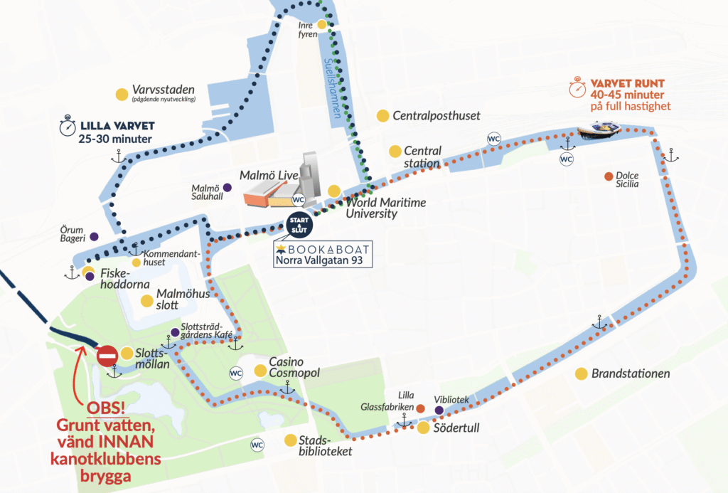 Malmö är fullt av spännande platser – och många av dem ser du bäst från kanalen. Här hittar du vår kanalkarta (som även finns i varje båt) samt en karta med bakgrundsinformation om platserna du kör förbi.